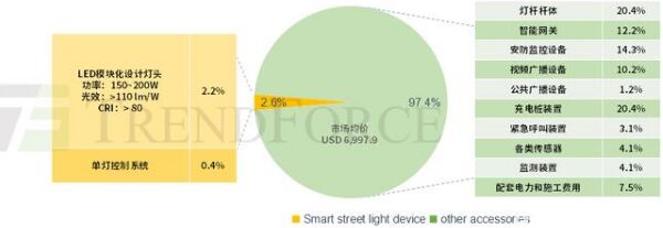 集邦咨詢旗下光電研究處LEDinside最新發布的《2020全球LED照明市場報告-照明級封裝與照明產品趨勢》數據顯示,預估2024年全球LED智慧路燈市場(智慧路燈市場規模僅包含燈頭產品和單燈控制系統)規模為 10.94億美金,2019至2024年復合增長率為8.2%。 集邦咨詢分析師劉玲麗表示,下游LED照明需求與宏觀經濟發展高度相關,盡管疫情帶來的影響存在諸多不確定性,但全球各地政府進行不同程度的財政刺激政策以及新建智慧城市,投資新型基礎設施,以緩解COVID-19對經濟產生的負面影響,尤其在中國和北美地區,道路建設是其投資支出大項,如,美國政府于2019年道路建設總體支出金額為976億美金(+6.34%YoY),戶外LED路燈照明將受益于此。LED路燈照明廠商包括Signify、AcuityBrands、Zumtobel、光林 (光寶集團旗下照明品牌) 與洲明科技等近2年持續不斷地推出戶外智慧照明新品和整體解決方案,將加速智慧路燈市場滲透。 從智慧路燈項目建設成本角度來看,集邦咨詢表示,廣義來說, 智能燈桿主要包含6大核心功能:1)智慧照明; 2)信息發布; 3)安防監測; 4)環境檢測; 5)充電樁; 6)5G微基站平臺。在其功能配件中,智能照明設備為100%標配產品,包含LED模塊化設計燈頭和單燈控制器。據集邦咨詢走訪調研,最高配備(選配)智能燈桿市場均價為6,997.9美金,其中智能照明設備市場均價為182.5美金,占比2.6%。