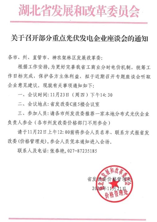 11月21日,湖北省發改委價格管理處發布《關于召開部分重點光伏發電企業座談會的通知》,為更好完善湖北省工商業分時電價機制,統籌工作目標完成,保護各方主體利益,湖北省發改委擬于11月23日召開專題座談會聽取企業意見建議。 通知如下: